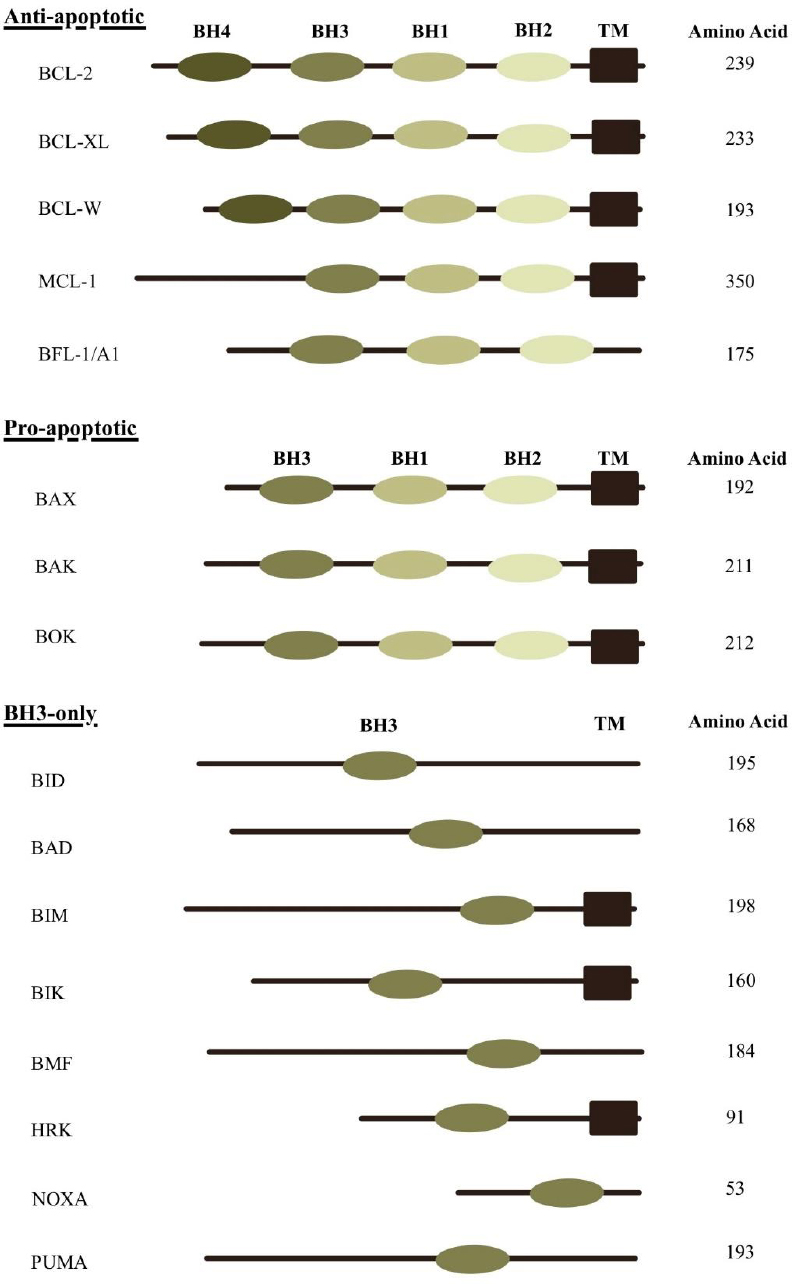 The BCL-2 protein family is categorized into three major groups based on domain structure and function: multidomain pro-apoptotic proteins, multidomain anti-apoptotic proteins, and BH3-only proteins. These proteins are characterized by the presence of conserved BCL-2 homology (BH) domains and, in many cases, a transmembrane (TM) domain that anchors them to intracellular membranes. The pro-apoptotic proteins BAX, BAK, and BOK contain BH1, BH2, and BH3 domains. The anti-apoptotic members, such as BCL-2, BCL-XL, and BCL-W, possess BH1 through BH4 domains, while MCL-1 and BFL-1/A1 include BH1 to BH3. In contrast, BH3-only proteins—including BID, BAD, BIM, BIK, BMF, HRK, NOXA, and PUMA—contain only the BH3 domain, which is essential for initiating apoptosis through interaction with other BCL-2 family members.