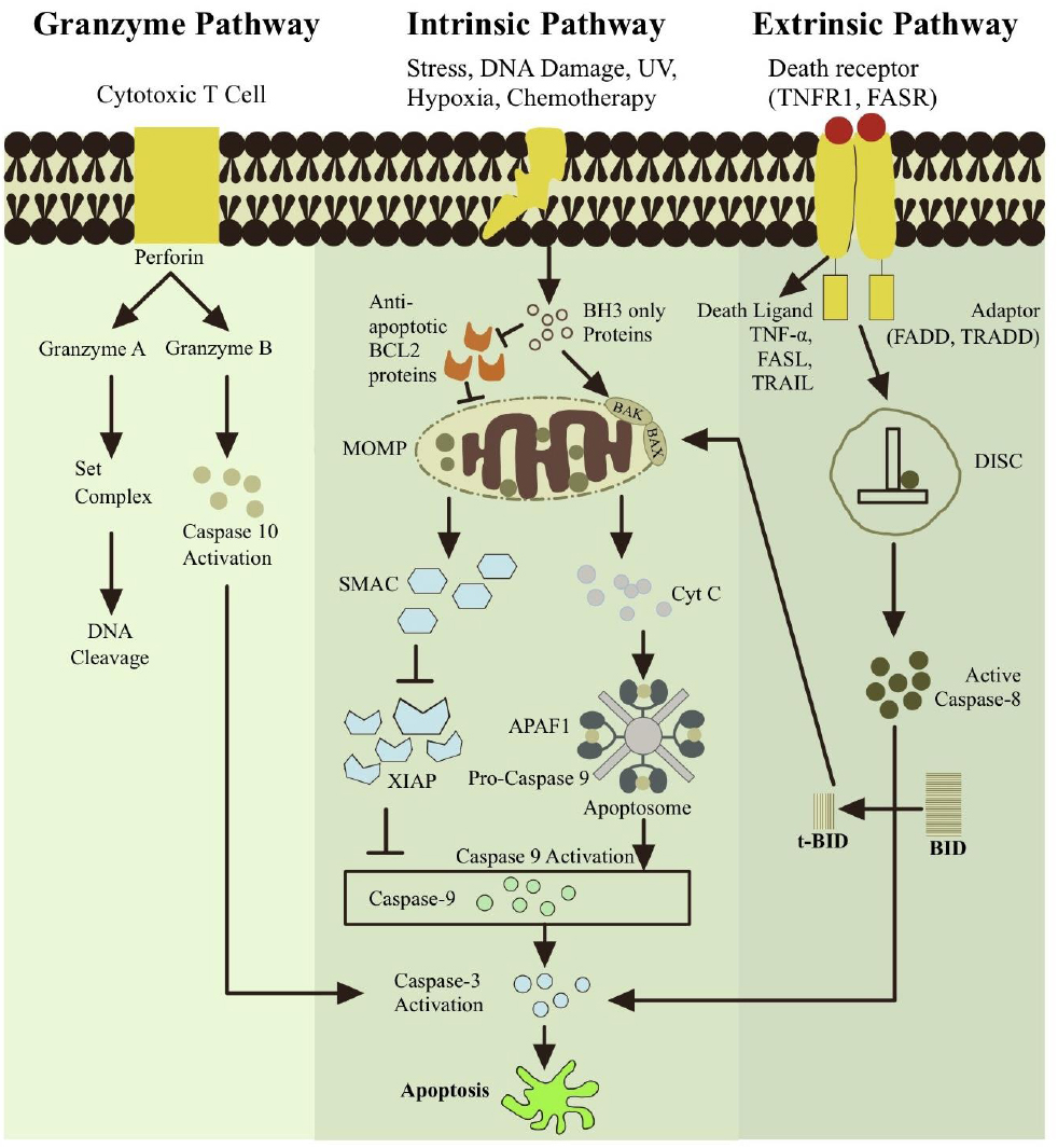 The extrinsic, intrinsic, and perforin/granzyme pathways are the three main classifications of apoptotic pathways. Each pathway is controlled by activating distinct caspases and starts with a distinct signal from the cell that causes death. Death receptors (DRs) and death-inducing ligands interact through their adaptor domains to initiate the extrinsic pathway. This process is then regulated by the multiprotein complex DISC and caspase-8. The stimuli initially activate BH3-only proteins in the intrinsic apoptotic pathway. After stimulating interactions between BCL-2 members resulting in a MOMP complex, cytochrome c is released, triggering the apoptotic signals. Cytochrome c and other caspase activation drive this route. Granzyme A and Granzyme B are secreted by cytotoxic T cells in the perforin/granzyme pathway. The caspase-independent mechanism of the granzyme A pathway. Granzyme B triggers apoptosis by activating caspase-10, which is connected to the intrinsic route. In this case, caspase-3 is eventually activated by all pathways. Nevertheless, apoptosis is ultimately induced by caspase-3 activation. Chromosomes and cytoskeletal proteins are among the vital components of cells that are broken down by caspase-3. Apoptotic bodies form as a result, and phagocytic cells consume and eliminate them before the organism does.