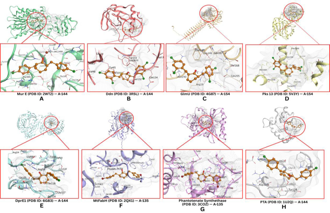 The molecular docking results of halogenated benzylidene-cyclohexanone compounds against Mycobacterium tuberculosis (Mtb) receptors showed the highest affinities for compound A-135 with MtFabH and pantothenate synthetase; compound A-144 with MurE, DprE1, and PTP; and compound A-155 with Ddn, GlmU, and Pks1.