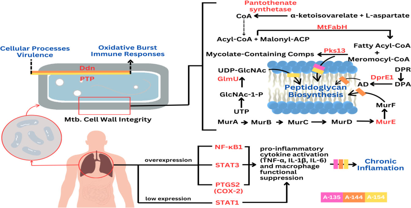 Signal Transducer and Activator of Transcription 3 (STAT3) is a central transcription factor that plays a crucial role in modulating immune responses during Mtb infection. STAT3 is activated by cytokines, such as IL-10 and IL-6, secreted by immune cells during Mtb infection, and upon activation, it translocates to the nucleus where it regulates genes involved in cell proliferation, differentiation, and immune regulation. In tuberculosis, STAT3 activation occurs in both infected macrophages and bystander immune cells, exerting complex immunomodulatory effects. Specifically, activated STAT3 suppresses the expression of key pro-inflammatory cytokines, including IL-6, TNF-α, IFN-γ, and MIP-1β, and inhibits nitric oxide (NO) production by repressing inducible nitric oxide synthase (iNOS). This suppression limits the microbicidal activity of macrophages, facilitating intracellular survival of Mtb [52]. In this study, based on in silico analyses, we evaluated a combination of compounds, A-135, A-144, and A-154, that may inhibit STAT3 activation by interfering with its phosphorylation and nuclear translocation, potentially restoring pro-inflammatory mediator expression and enhancing macrophage antimicrobial functions. These findings suggest that targeting STAT3 with this compound combination could serve as a promising adjuvant therapeutic strategy in tuberculosis, pending further experimental validation.