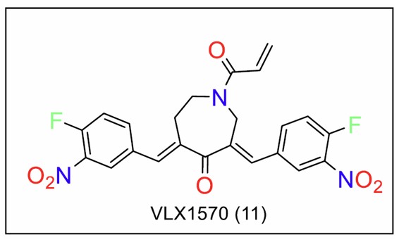 The synthesis of VLX 1570 (Fig. 15) involves a multi-step procedure beginning with the formation of a key intermediate via condensation of 4-perhydroazepinone hydrochloride with 4-fluoro-3-nitrobenzaldehyde under acidic conditions for around 100 hours. This intermediate is then functionalized by coupling with alkenyl carboxylic acids using propylphosphonic anhydride as a coupling reagent, typically in the presence of triethylamine and tetrahydrofuran solvent at low temperature.