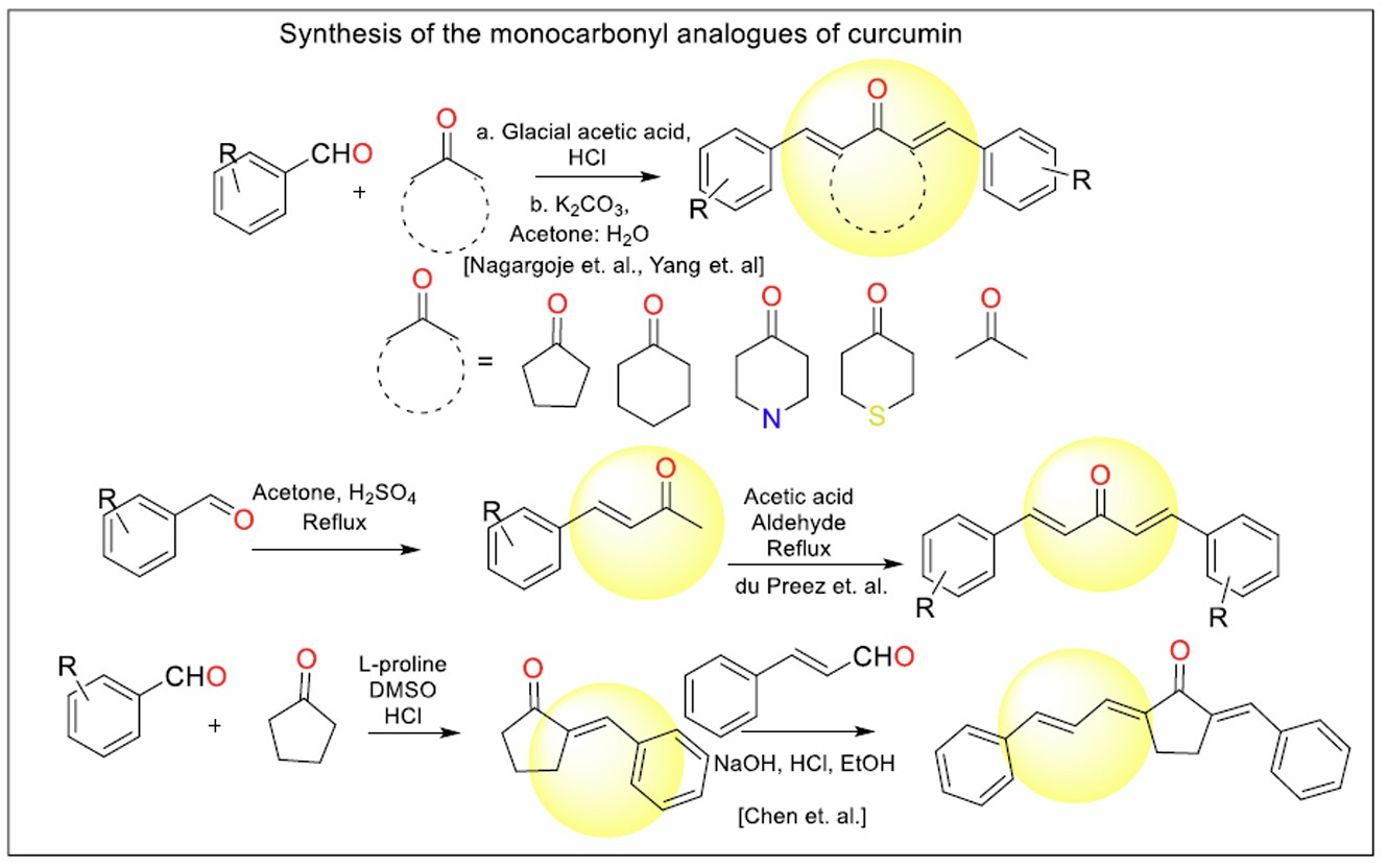 The general scheme for the synthesis of monocarbonyl analogues of curcumin is represented in Fig. (12). Aromatic aldehydes undergo condensation with cyclic or straight-chain ketones to give the respective analogues.