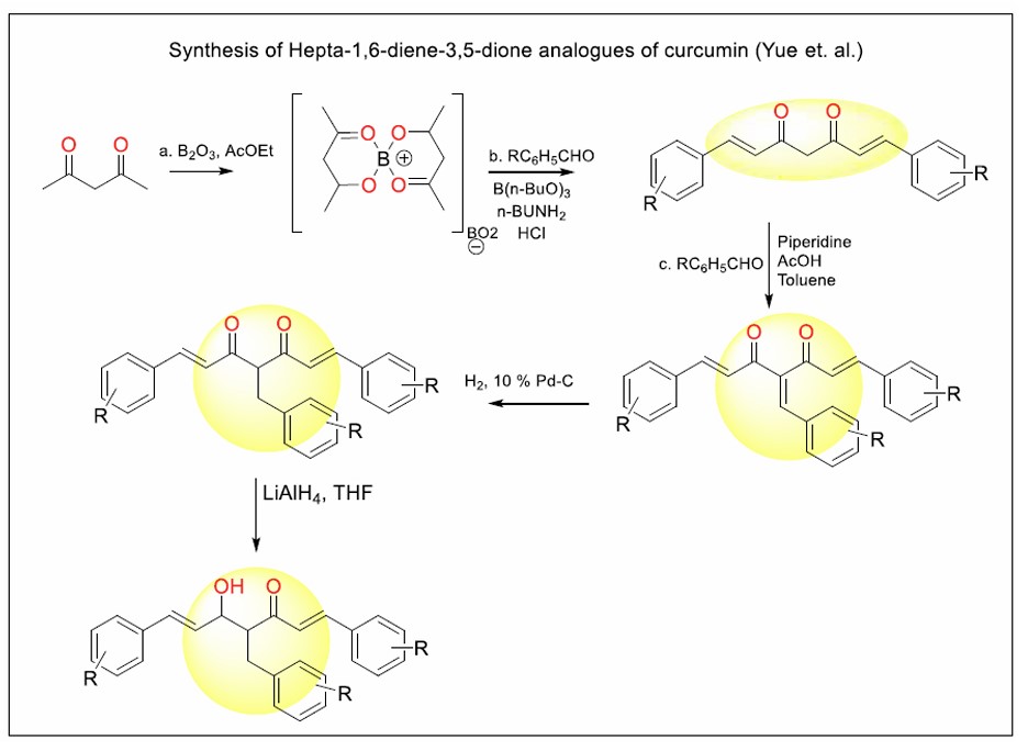 Figure 14 represents the boron-mediated aldol condensation and subsequent functional group modification protocol used to synthesise hepta-1,6-diene-3,5-dione analogues of curcumin. The process begins with the formation of a boron complex from acetylacetone and boric acid, facilitating the condensation with substituted aromatic aldehydes in the presence of base and acid to construct the conjugated dione scaffold characteristic of curcumin analogues. Further, this intermediate can undergo modifications such as piperidine/AcOH–catalysed condensation with additional aldehydes for structural extension, catalytic hydrogenation using palladium on carbon to saturate carbon–carbon double bonds, and reduction with lithium aluminium hydride (LiAlH4) in THF to yield hydroxy derivatives. Through these steps, a diverse array of curcumin analogues with altered core motifs and functionalities is produced, aiming to enhance metabolic stability and modulate biological activity compared to native curcumin [95].