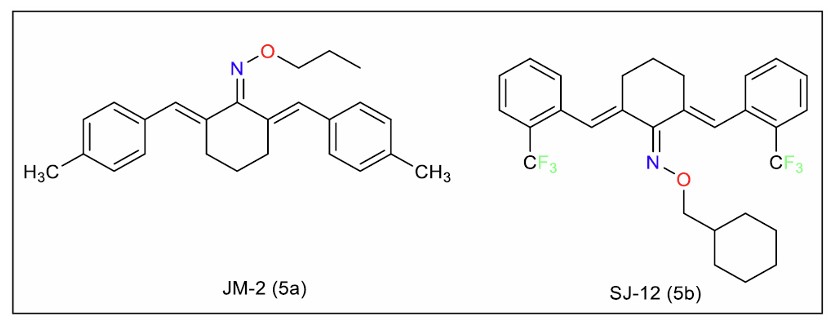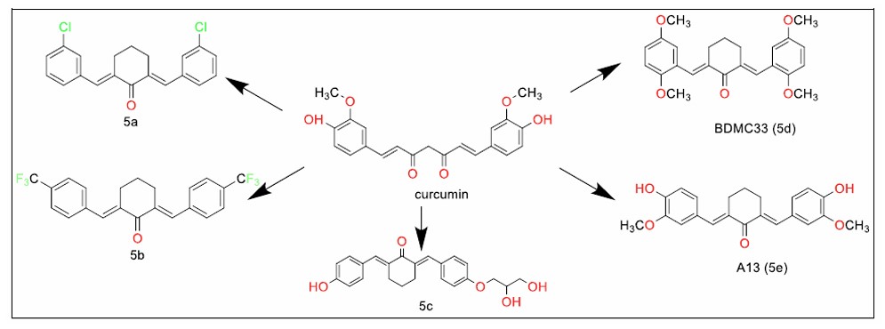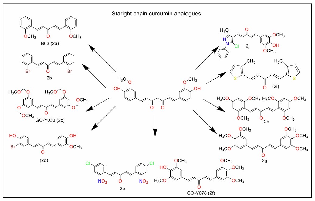 To address the instability associated with curcumin’s β-diketo chain, researchers have explored monocarbonyl analogues, which replace the β-diketo group with a more stable heterocyclic moiety. These compounds have been discussed here as piperidone analogues (Fig. 1, series 1a-1h), straight chain analogues (Fig. 2, series 2a-2j), cyclopentanone analogues (Fig. 3, series 3a-3h), and cyclohexanone analogues (Fig. 4, Series 5a – 5e)).