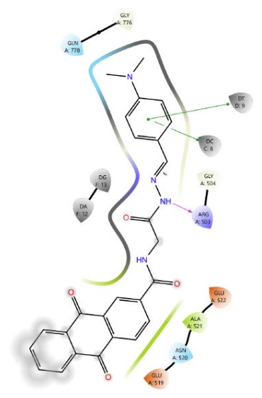 DNA intercalators and Topoisomerase II (Topo II) poisons exhibit three critical structural features that are fundamental to their function: a planar polyaromatic system, a basic group that can be ionized, and a groove-binding side chain [35]. The rationale behind our molecular design was based on the fusion of anthraquinone with the amino acids proline and glycine, which demonstrated more favorable and additional binding interactions compared to the amino sugars found in anthracyclines, such as the reference compound doxorubicin. Subsequently, various moieties were incorporated to produce Schiff base and sulfonamide derivatives. The resulting scaffolds, functioning as chromophores, were effectively integrated within the groove-binding region and provided enhanced interactions with the Topoisomerase II enzyme and the DNA pocket. These led to improved binding free energy and enhanced interaction profiles. The corresponding docking scores are presented in (Table 1). The root mean square deviation (RMSD) value for the docking of the co-crystallized ligand was 1.918 Å, which validates the accuracy of the docking protocol.