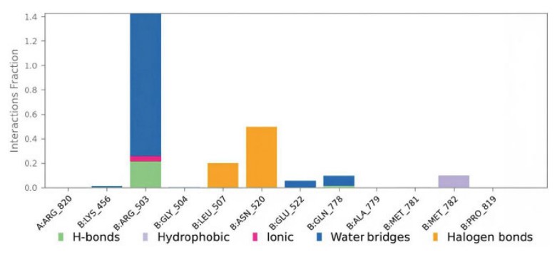 Compound 3a contacts with the protein residues are illustrated in Fig. (9). Values over 1.0 are possible as ARG503 made multiple interactions of the same subtype with the ligand.