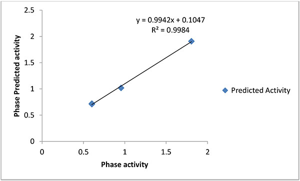 Common pharmacophore hypothesis was selected and the tree-based partition algorithm was used to generate the four variants of probable common hypotheses [15]. Further, the hypothesis of pharmacophore was selected and used to rigorous scoring faction analysis. During the development of hypotheses for pharmacophore were created for both sub-datasets. The analysis of best scores and alignment of the pharmacophore hypothesis, AAAP.116 was selected to generate the atom-based 3D-QSAR model (Table 5), which depends on the IC50 activity against Ebola virus replication in Vero E6 cells and phase predicted activity (Fig. 2).