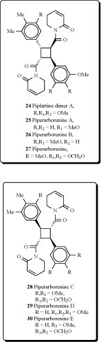 Two new cyclobutanoid amides, piplartine-dimer A (24), piperarborenine A (25) and B (26), and piperarboresine (27) were isolated from the stem of Piper arborescens [55]. Piplartine dimer A (24) has also been obtained from extracts of three piper species: P. Aborescens, P. rugosum, P. tuberculatum [56-58].