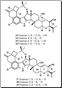 Penitrem G (39), a new alkaloid, has been isolated together with the already known mycotoxins penitrems A-D and F from the mycelium of Penicillium crustosum [75]. Penitrems A-D and F showed convulsive and insecticidal activities against both insect species. A prominent novel analog pennigritrem (40) of penitrem A, resolved from the tremorgenic alkaloids of a strain of Penicillium nigricans, showed to involve the terminal diterpenoid isoprene in a cyclization which is unique among fungal indole-diterpenoids [76].