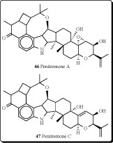 A new group of microbial metabolites, designated penitremones A-C, have been characterized by MS and NMR spectroscopy as 10-keto, and 11,33-dihydro-variants of the penitrem indole-isoprenoid skeleton. The principal metabolite penitremone A (46), and minor (47) produced with penitrem A by a Penicillium sp., is an isomer of penitrem E and was also similarly tremorgenic [80]. Different biological activities for penitrem A (33) have been studied and reported in some articles [81-88].