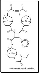 A tropane alkaloid with a 2-methyl-4-phenyl-cyclobutane 1,2,3-tricarboxylic acid ester as the central structure was isolated from the aerial parts of Schizanthus grahamii and named grahamine (8) [26].
