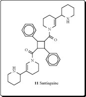 Adenocarpus complicatus subspecies aureus (Papilionacea) yielded alkaloids: (+)-santiaguine (0.14%, 11), racemic santiaguine (0.01%), (+)-adenocarpine (0.23%), and isoorensin (0.18% of dried plant) [28]. Santiaguine has also been isolated from Adenocarpus mannii,Adenocarpus foliosus, Adenocarpus intermedius and A. parvifolius [29-40].