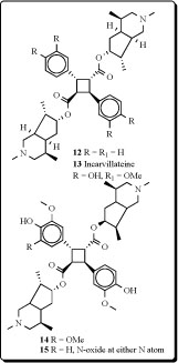 Structures of monoterpene alkaloid derivatives and spermine related compounds (12,13) isolated from Incarvillea sinensis were detected by physico-chemical methods. Among them, incarvilateine (13) showed strongest analgesic and sedative activities [41-42]. Methoxyincarvillateine (14), and the N-oxides (15) with similarly structurehave been obtained from extract of the Incarvillea sinensis [43].