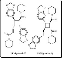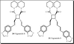Two other new alkaloids possessing a cyclobutane ring, named pipercyclobutanamides A (22) and B (23), have been isolated from the fruits of Piper nigrum [52]. Isolated compounds were potent mechanism-based inhibitors of cytochrome P 450 2D6 (CYP2D6) [53-54].