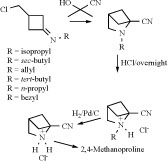 Synthesis of 2,4-methanoproline and derivatives have been reported by several authors. Most of the syntheses of 2,4-methanoproline are accomplished by an intramolecular light-induced [2+2] cycloaddition of an appropriate diene [11-12]. Only Gaoni used an intramolecular cyclization strategy for his approach [13]. Also analogues containing the 2-azabicyclo[2.1.1]hexane skeleton are often synthesized by the light-induced [2+2] cyclization [14-17]. The rearrangement of an appropriate bromohydrine to synthesize 5-hydroxy-2-azabicyclo[2.1.1]-hexanes has also been described [18-19]. A two-step synthetic approach toward 3-(chloromethyl)cyclobutanone was described and used in the synthesis of 2,4-methanoproline analogues [20]. The key step consists of a reversible addition of hydrogen cyanide onto the imines (Scheme 1).