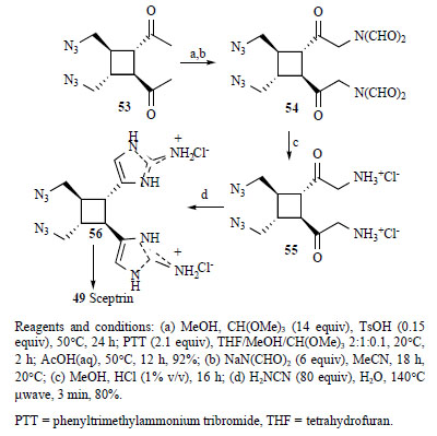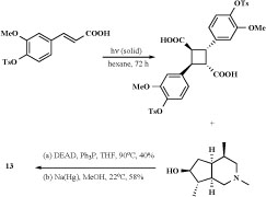 The [2+2] photodimerization of trans-cinnamic acids in the crystalline state gave R-truxillic acid. Condensation of the R-truxillic acid with 2 equiv of the above-described (+)-6-epi-incarvilline under Mitsunobu conditions produced tosyl-protected incarvillateine (Scheme 2). Deprotection of the tosyl groups using sodium amalgam in methanol provided (-)-incarvillateine (13) as colorless crystals. The optical rotation and spectroscopic properties (1H and 13C NMR) of synthetic (13)were in agreement with those reported for natural incarvillateine [44]