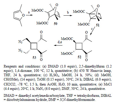 Reagents and conditions: (a) DMAD (1.0 equiv), 2,5-dimethylfuran (1.2 equiv), 1,4-dioxane, 100 °C, 12 h, quantitative; (b) 450 W Hanovia lamp, THF, 24 h, quantitative; (c) H2SO4, MeOH, 24 h, 50%; (d) MeOH, CH(OMe)3 (14 equiv), TsOH (0.15 equiv), 50°C, 24 h; DIBAL (6.0 equiv), CH2Cl2, -78 °C, 1.5 h, then AcOH, H2O, 10 min, quantitative; (e) MsCl (4.4 equiv), 20°C, 1 h; NaN3 (6.0 equiv), DMF, 50°C, 24 h, quantitative.