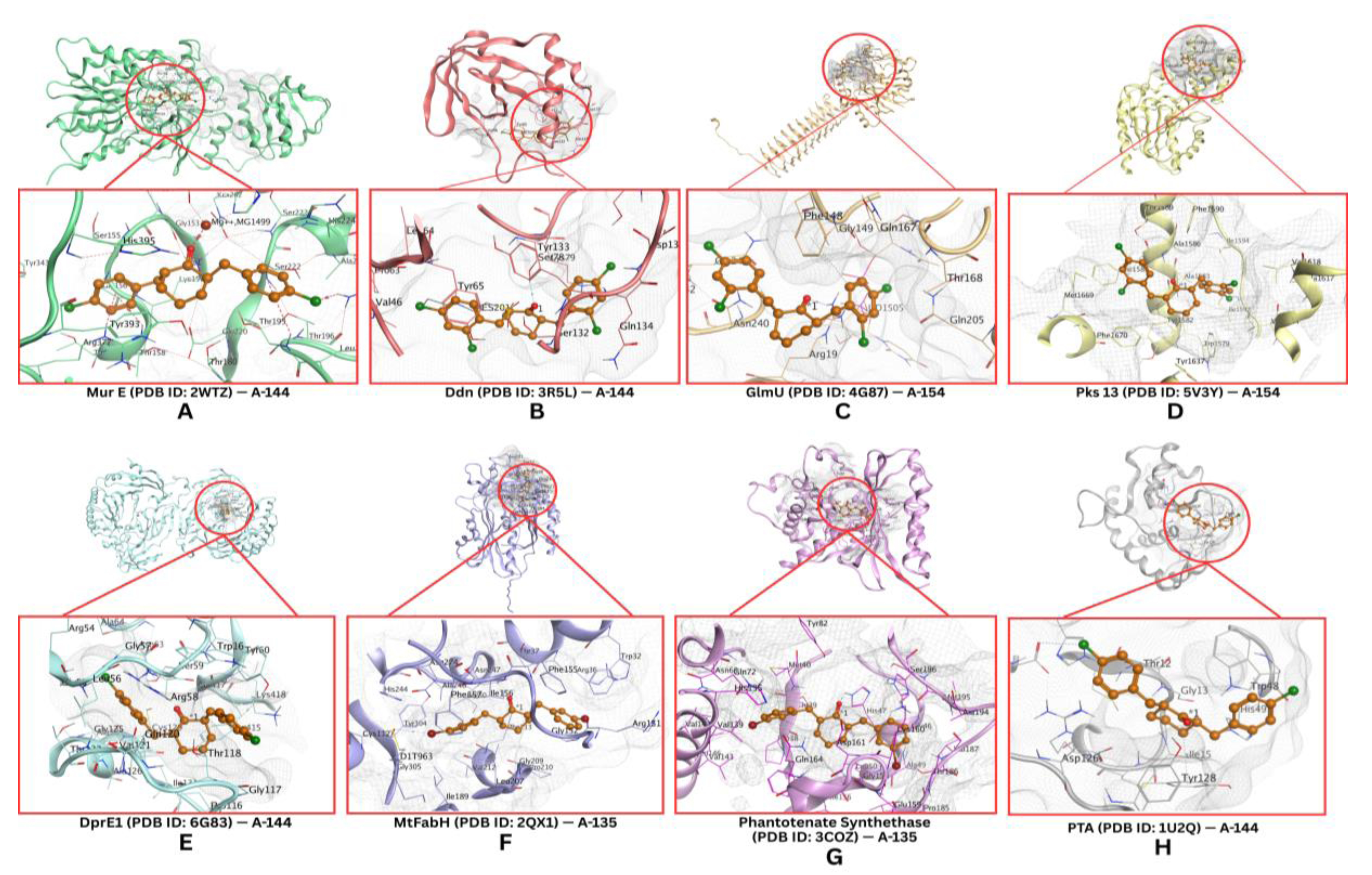 The molecular docking results of halogenated benzylidene-cyclohexanone compounds against Mycobacterium tuberculosis (Mtb) receptors showed the highest affinities for compound A-135 with MtFabH and pantothenate synthetase; compound A-144 with MurE, DprE1, and PTP; and compound A-155 with Ddn, GlmU, and Pks1.