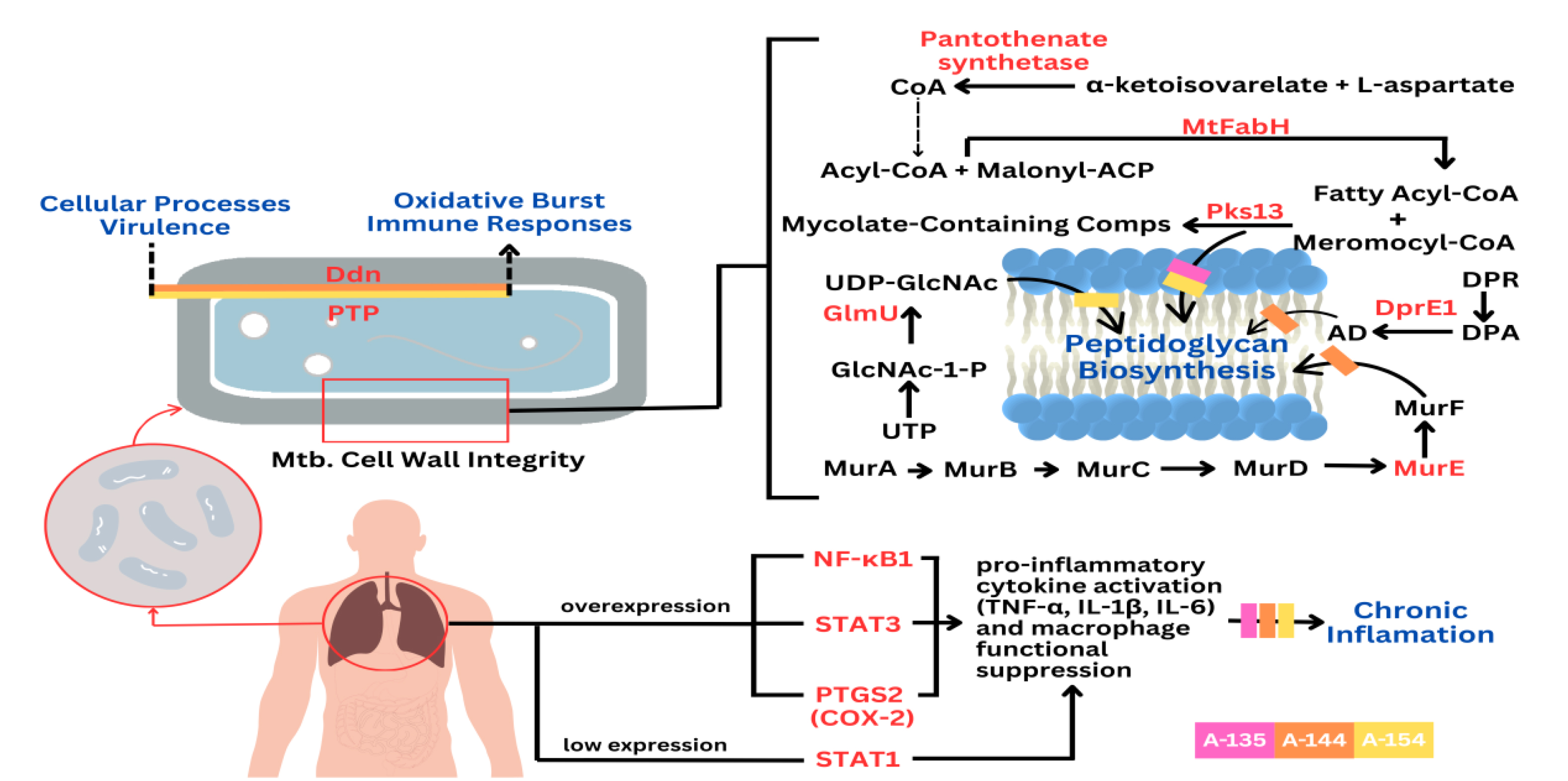 Proposed mechanism of action of combined halogenated benzylidene-cyclohexanone analogs a-135, a-144, and a-154 in counteracting Mycobacterium tuberculosis (Mtb) survivability and the chronic inflammatory manifestations of tuberculosis.