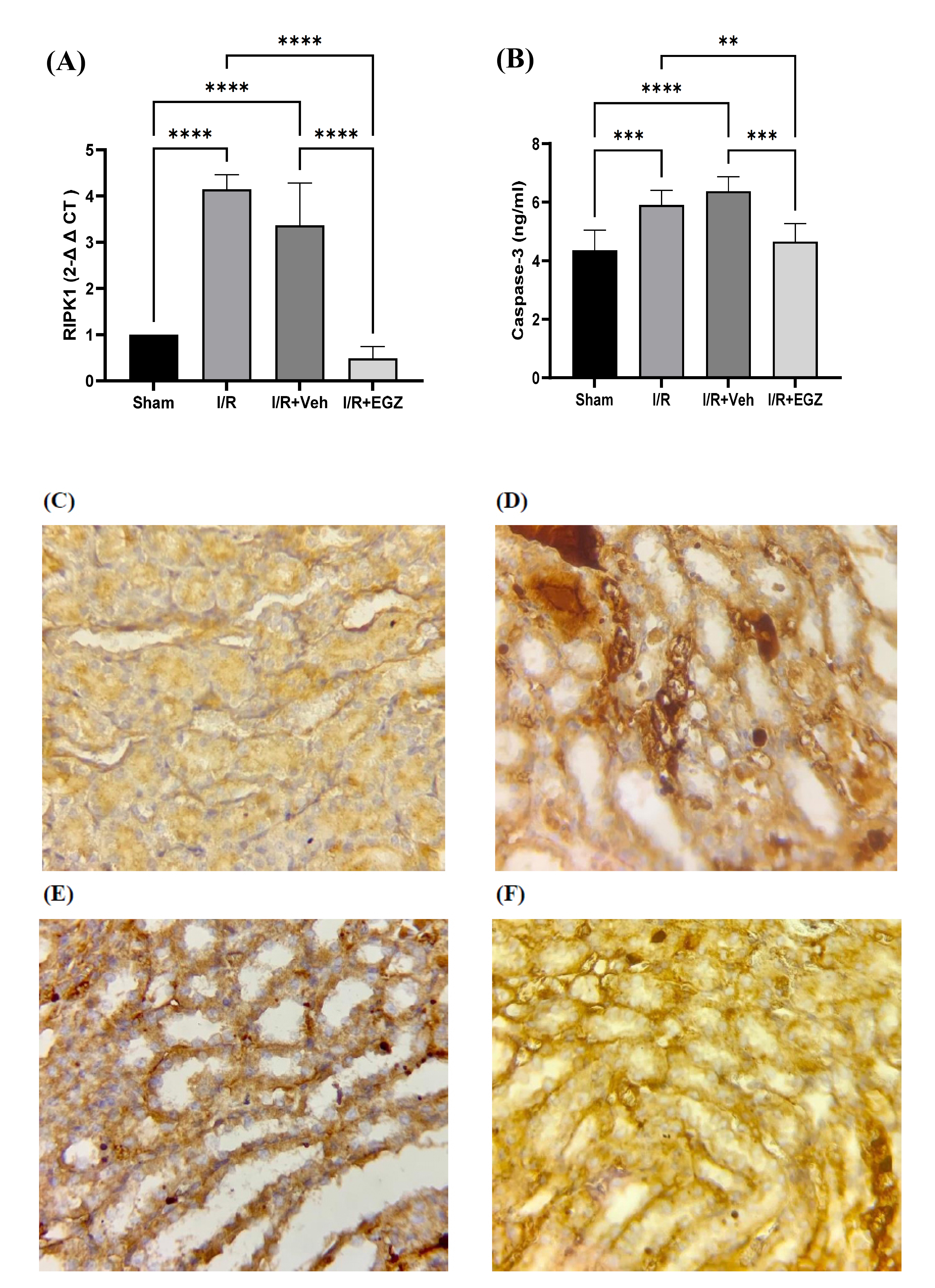 Effects of ertugliflozin on the necroptosis pathway, (A) RIPK1 (Fold change), (B) Caspase-3, (C) Immunostaining image of MLKL in renal tubules of the sham group, (D) Immunostaining image of MLKL in renal tubules of the I/R group, (E) Immunostaining image of MLKL in renal tubules of the I/R+Veh group, (F) Immunostaining image of MLKL in renal tubules of the I/R+EGZ groups. The sham group underwent laparotomy without induction of the I/R model. The I/R, I/R+Veh, and I/R+EGZ groups were subjected to 30 minutes of bilateral renal ischemia and 24 hours of reperfusion. The I/R+Veh and I/R+EGZ groups received the solvent or 20 mg/kg of ertugliflozin intraperitoneally one hour before ischemia induction, respectively. RIPK1 was measured in renal tissue by RT-qPCR; the fold change was calculated by the 2-ΔΔCT method. Caspase-3 was measured in renal tissue using the ELISA technique. MLKL was measured in renal tissue by IHC staining. Data expressed as Mean ± SD, **p < 0.01, ***p < 0.001, ****p < 0.0001.