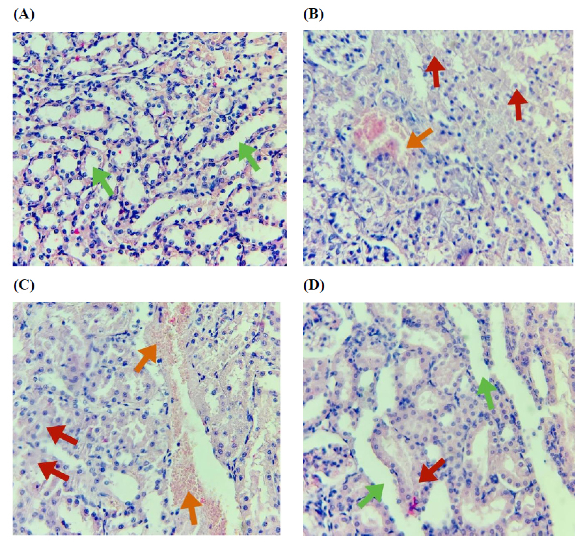 Histopathological photomicrographs of the study groups. (A) Sham group: Normal histology, (B) I/R group: Renal tubules showing a damage score of 4, affecting 80% of the observed tubules, (C) I/R+Veh group: Renal tubules showing a damage score of 4, affecting 85% of the observed tubules, (D) I/R+EGZ group: Renal tubules showing a damage score of 2, affecting 40% of the observed tubules. The sham group underwent laparotomy without induction of the I/R model. The I/R, I/R+Veh, and I/R+EGZ groups were subjected to 30 minutes of bilateral renal ischemia and 24 hours of reperfusion. The I/R+Veh and I/R+EGZ groups received the solvent or 20 mg/kg of ertugliflozin intraperitoneally one hour before ischemia induction, respectively. Green arrow (normal renal tubules), red arrow (disruption of renal tubular integrity), orange arrow (vascular congestion and hemorrhage). Histopathological examination was done by H&E staining. Magnification X400. Data expressed as Mean ± SD.