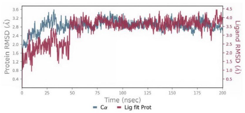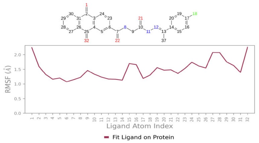 The conformational changes in the protein and ligand from their initial configurations during the simulation were analyzed using root mean square deviation (RMSD). The ligand RMSD result for Compound 3a, illustrated in Fig. (10), remained below 4 Å, indicating acceptable stability of the ligand–protein interaction. This observation is further supported by the dynamic behavior of the complex, which exhibited noticeable fluctuations during the initial 50 ns of the simulation, followed by a stable trajectory with consistent structural integrity throughout the remaining simulation period.