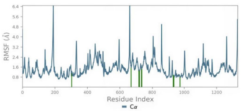 The protein RMSF (Protein residues that interact with the ligand are marked with green-colored vertical bars).