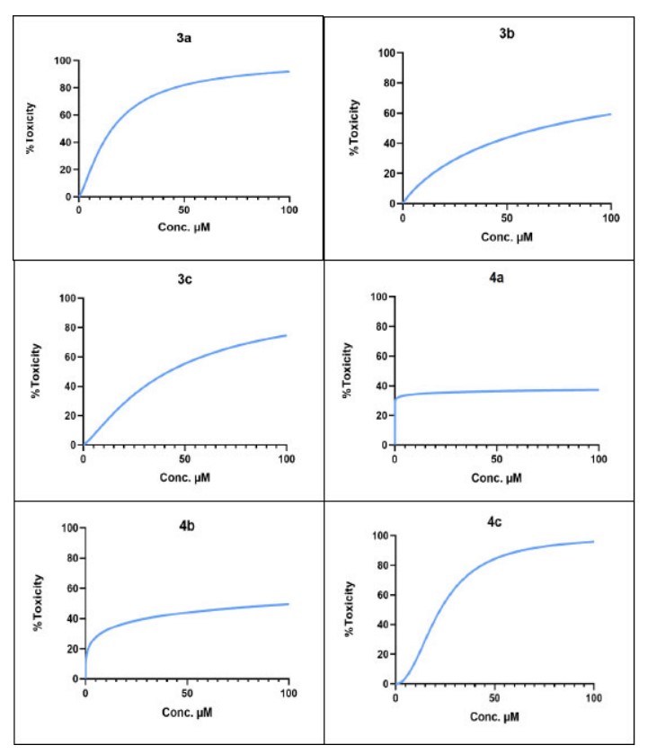 The concentration-response curve of final compounds (3a, 3b, 3c, 4a, 4b and 4c) on HCT-116 colorectal cancer cell line.
