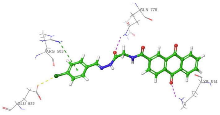 3D view of the interactions between compound 3a and Topoisomerase II (PDB ID: 4G0V). The purple dotted line represents hydrogen bonding with GLN778 and LYS814; the yellow dotted line indicates a chloride interaction with GLU522 and a water molecule; and the green and blue dotted lines depict π-cation and aromatic hydrogen bond interactions with ARG503, respectively.