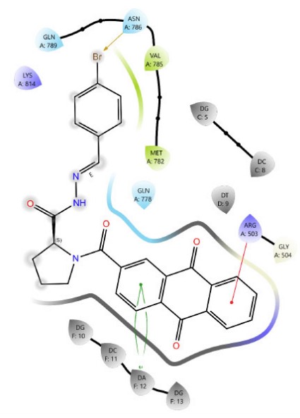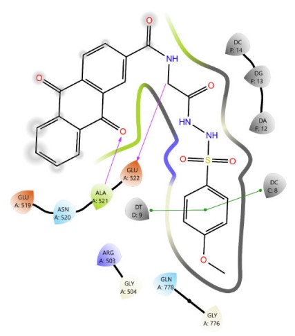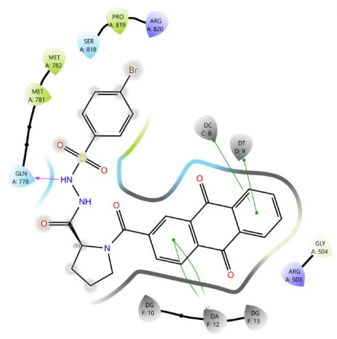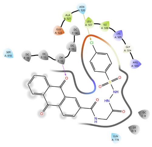 DNA intercalators and Topoisomerase II (Topo II) poisons exhibit three critical structural features that are fundamental to their function: a planar polyaromatic system, a basic group that can be ionized, and a groove-binding side chain [35]. The rationale behind our molecular design was based on the fusion of anthraquinone with the amino acids proline and glycine, which demonstrated more favorable and additional binding interactions compared to the amino sugars found in anthracyclines, such as the reference compound doxorubicin. Subsequently, various moieties were incorporated to produce Schiff base and sulfonamide derivatives. The resulting scaffolds, functioning as chromophores, were effectively integrated within the groove-binding region and provided enhanced interactions with the Topoisomerase II enzyme and the DNA pocket. These led to improved binding free energy and enhanced interaction profiles. The corresponding docking scores are presented in (Table 1). The root mean square deviation (RMSD) value for the docking of the co-crystallized ligand was 1.918 Å, which validates the accuracy of the docking protocol.