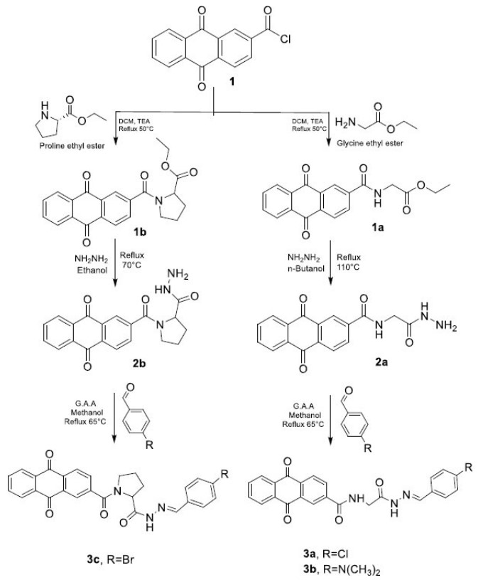 2.5.1. Synthesis of Ethyl (9, 10-dioxo-9, 10-dihydroanthracene-2 carbonyl)glycinate (1a) [28]
