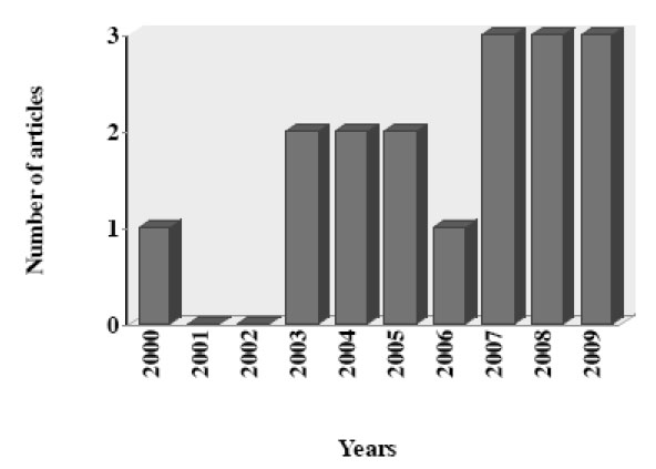 In this article, we review the reports about the antiprotozoal activity of PIs. Data was selected from medical literature published in any language using Medline since 1995 to 2009 for published literature. Search terms were each PI combined with all protozoa parasite with medical importance. The search strategy yielded a total of 27 articles during the last 15 years, including one review article. After initial screening, nine articles were excluded which did not evaluated antiprotozoal activity of PIs (8) or did not provided the necessary data (1). The data recovered by year of publication shown an increase of articles published in the last three years (Fig. 3).