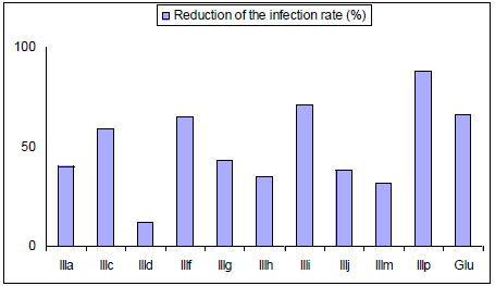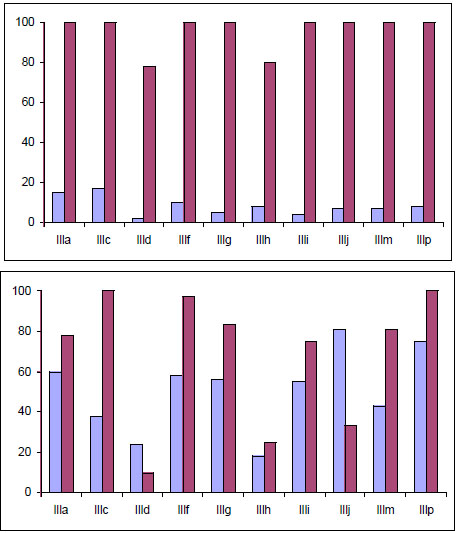 All mono-THTT derivatives studied showed significant in vitro antiprotozoan activity (both anti-trichomonas and anti-trypanosoma) at the highest dose tested (100 µg/mL), except for compound L-IIIe. (Fig. 6). The results obtained at 10 and 1µg/mL (Fig. 7) showed that the nature of substituents not afforded important differences in the trichomocidal activity (%R) of the three series studied, since most of the compounds lose their trichomonacidal activity at 10 µg/mL. This fact seems to indicate that the lipophilic character of R1 does not influence the in vitro trichomonacidal activity significantly. Only two compounds of series III (D-IIIj and IIIm) maintain their efficacy at 10 µg/mL and again IIIm was the most active compound at 1 µg/mL (%R=59), with a trichomonacydal effect similar to that of Metronidazole at 0.1 µg/mL (%R=52). None of the compounds studied were more active than Metronidazole (Fig. 6). The most active compounds, L-IIId, D-IIIj and IIIm, that were assayed in vivo, showed a reduction in the pathogenecity index, and this was mainly true for compound IIIm [9].