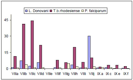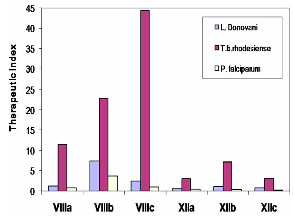In vitro activity of compounds belonging to series VIII and IX against Leishmania donovani, Trypanosoma brucei rhodesiense, and Plasmodium falciparum.