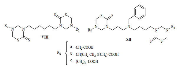 It has been reported that bis-thiadiazines have antifungical, antimicrobial and antiprotozoal activity [19-22, 34]. Specifically with antiprotozoal activities three series of bis-THTT had been reported [21, 22, 34]. The in vitro activity of compounds belonging to series VIII and IXI (Fig. 11) against Leishmania donovani, Trypanosoma brucei rhodesiense, and Plasmodium falciparum was studied. From these results it may be observed (Fig. 12) that the best activity profiles were found against T. b. rhodesiense. It is intereresting that the activity against T. b. rhodesiense seems to be favoured for compounds having linear aminoacidic residues as substituents in N-5 of the THTT ring. Despite exerting a notable activity against T. b. rhodesiense, derivatives from series VIII appeared to be more citotoxic than the analogs of series IX (Fig. 13) [34].