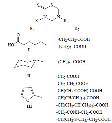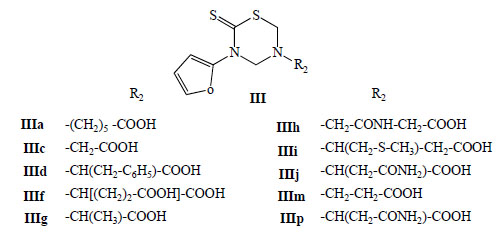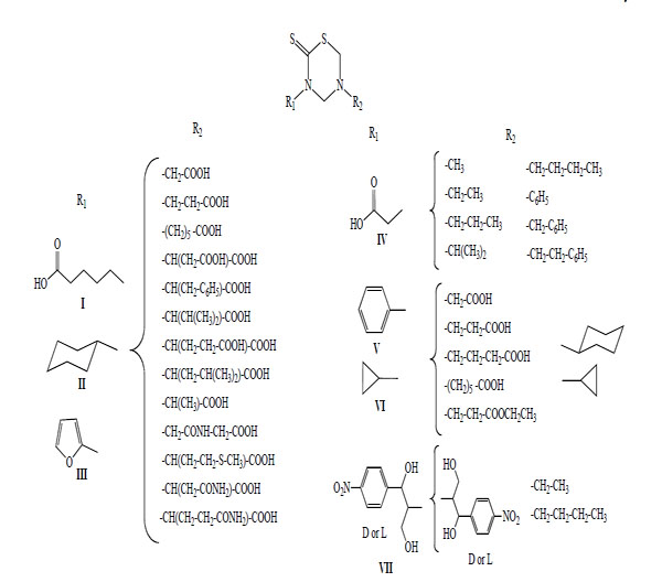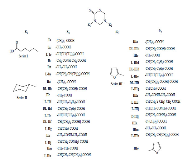 This methodology allowed the synthesis of 78 new mono-THTT derivatives to bunch up in at least seven series (Fig. 2). The series synthesized differ as to the nature (lipophilic or hydrophilic) of substituent at 3rd position. Some series bear an aromatic (furfuryl [9,11], benzyl [11] and D or L deacylated chloramphenicol [12]) and alkyl or cycloalkyl (ethyl, butyl, octyl, dodecyl, cyclopropyl and cyclohexyl) [9-11, 13-18] moiety, all of them lipophilic group; for other series the starting amines were hydrophilic (carboxyalkyl) group [9].