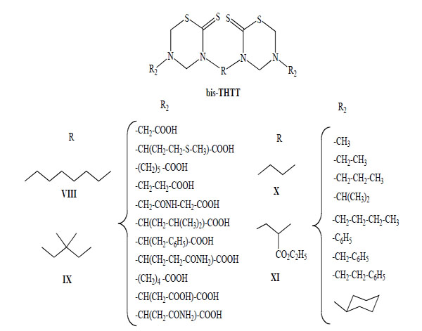 3,5-disubstituted tetrahydro-2H-1,3,5-thiadiazine-2-thione scaffold (mono-THTT) and alkyl-linked bis-(2-thioxo-[1,3,5] thiadiazinan-3-yl) carboxylic acids (bis-THTT).