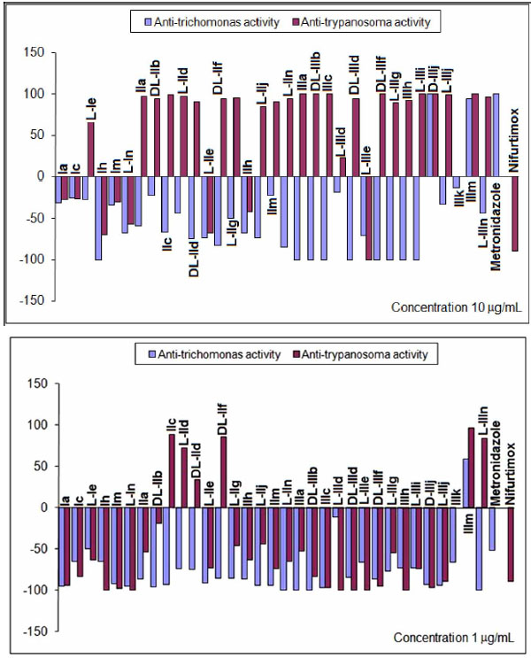 Compounds of series II and III showed trypanosomicidal activity, both at 100 and 10 µg/mL, whilst compound of series I only showed cytostatic activity at 10 µg/mL. This fact indicated that the lipophilic substituents at the N-3 were better than hydrophilic ones for obtaining active compounds against T. cruzi. Compounds IIc, L-IId, DL-IId, DL-IIf, IIIm and L-IIIn maintained trypanosomicidal activity at 1 µg/mL showing a higher activity than Nifurtimox. We have found more compounds with trypanosomicidal than trichomonacidal activity (Fig. 6) [9].
