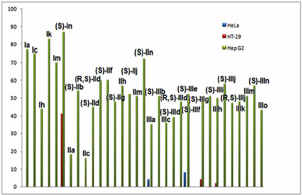 Cytotoxicity (IC50 (µmol/l)) of compounds belonging to series I, II and III against HeLa, HT-29 and Hep G2 cells.