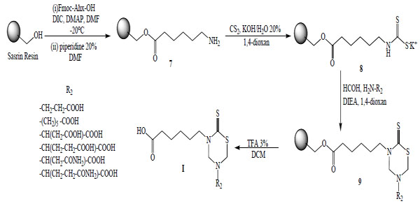 Another synthetic method used to obtain these compounds was the solid phase synthesis of 3-(5-carboxypentyl)-5-substituted tetrahydro-2H-1,3,5-thiadiazin-2-thione derivatives (Serie I). 6-Amino-n-hexanoic acid was attached via its C-terminal to hydroxymethyl polystyrene using a ‘SASRIN’ linker. The bound amino acid was transformed into the corresponding dithiocarbamate 8 followed by cyclization in the presence of formaldehyde and the corresponding free amino acids to afford 3-(5´-carboxypentyl)-5-substituted tetrahydro-2H-1,3,5-thiadiazin-2-thiones (9). The final products I were cleaved from the resin and obtained in moderate yields due to low solubility of the corresponding free amino acids in 1,4 dioxan (Scheme 2).