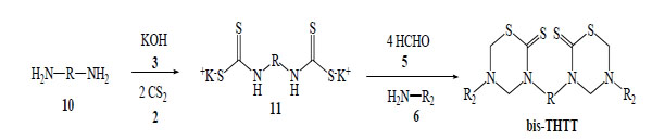The synthetic methods for obtaining bis-THTT have been much less reported in the bibliography than the synthetic route for mono-THTT [19-22]. The general procedure is very similar to the one used for mono-THTT. The bis-THTTs were always obtained using diamines 10 and the amounts of all reagents were duplicated. In the first step the diamine reacts with carbon disulfide 2 in the presence of potassium hydroxide 3 to obtain the expected bisdithiocarbamate salt 11. The addition of formaldehyde 5 and the corresponding amine or aminoacid (6) to 11 resulted in the cyclocondensation in a slightly alkaline medium (phosphate buffer, pH 7-8) to generate, after treatment with HCl 15%, the desired bis-THTT (Scheme3) [19-21].