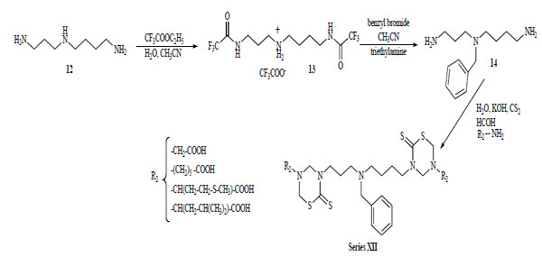 Recently, our group explored the feasibility of synthesis of new bis-THTT using more complex polyamines as linkage other than the initially reported diamines [22]. The N4-benzyl polyamine 14 was previously synthesized according to a methodology reported by O'Sullivan et al. [23] via a protection-deprotection strategy using ethyl trifluoroacetate as the selective protective group for primary amines in the presence of secondary amines. The synthetic route leading to derivatives of serie XII from the benzylated spermidine was similar to the one described above (Scheme 4).