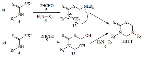 According to the authors, the formation of the thiadiazinane ring is performed via a one pot domino reaction between the pre-formed DTC, formaldehyde and the amino acid component. Despite being considered a multi-component reaction, the reactants are added in a stepwise fashion. Undoubtedly, one of the least explored aspects regarding the synthesis of THTT has been the study of the reaction pathway from the corresponding DTC. In one approach (Scheme 5a) the preformed DTC 4 is allowed to react simultaneously with formaldehyde and the corresponding amine to produce [substituted(aminomethyl)methanethionyl methylidenazanium 12 [20]. This species possesses two different reactive centers in the same molecular backbone, a protonated imine and a thiosulfanylmethylamino group. The intramolecular addition of the secondary amino group to the carbon atom of the methylidene moiety leads to the THTT ring. The formation of the THTT ring via a {[hydroxymethyl (substituted) carbamothioyl] sulfanyl}methanol intermediate 13 [13] was proposed (Scheme 5b). This process involves in situ generation of 13 from the corresponding DTC 4 and formaldehyde (5) followed by condensation with a primary amine. The isolation and characterization of an analogue of 13, via a crystallization process induced by the presence of KOH, was reported [13].