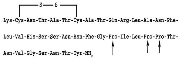 Amino acid sequence of the amylin analogue, pramlintide: Note the cystine bond at 2 and 7 positions. The disulfide bond must be intact in order for amylin analogues to be biologically active. The amino acids at positions 25, 28 and 29 have been replaced by proline (arrows).